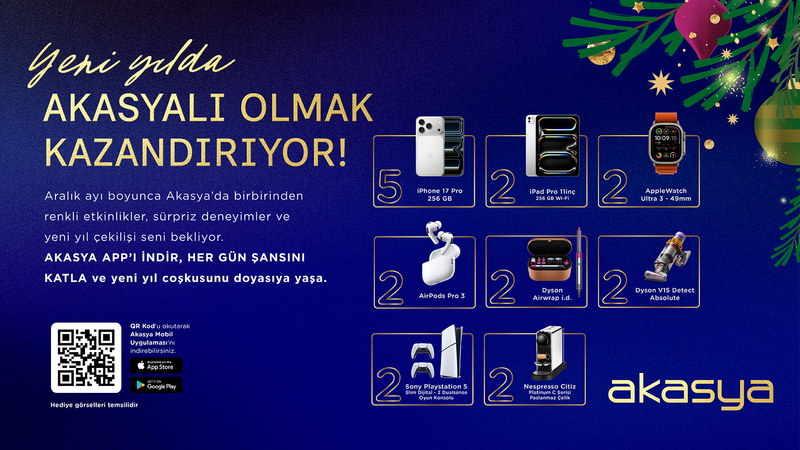 Aralık ayı boyunca Akasya Mobil Uygulaması’nı indiren kullanıcılar, 31 Aralık’a kadar uygulama üzerinden düzenlenen çekilişlere katılabiliyor. Çekiliş kapsamında teknoloji ve ev ürünlerinden oluşan çeşitli hediyeler yer alıyor.