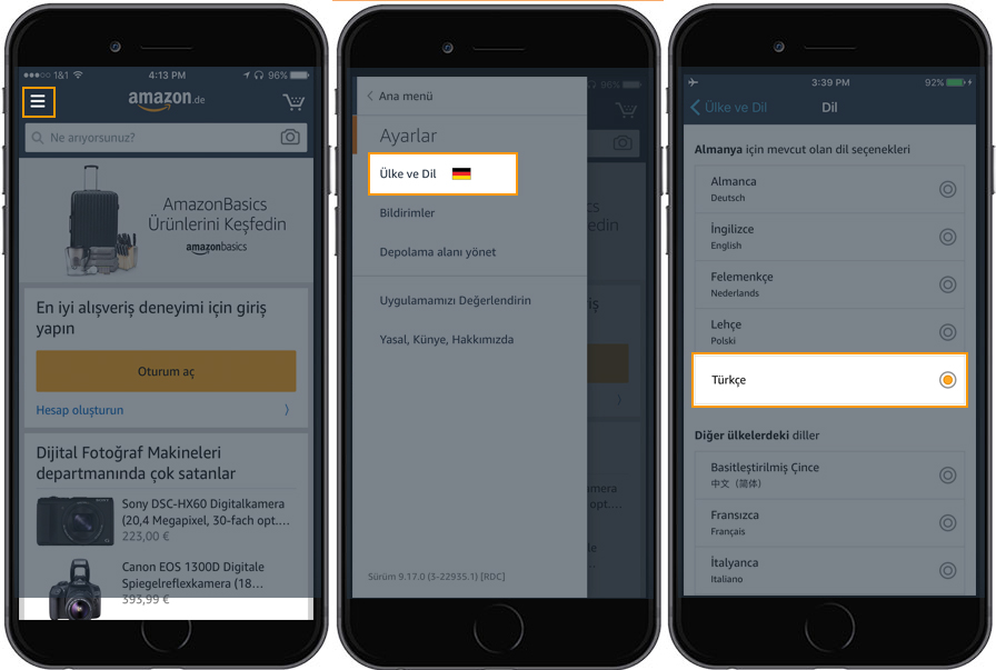 Amazon Shopping uygulamasını Türkçe olarak kullanmak isteyen kullanıcıların uygulamanın sol üst kısmında bulunan ''Ana Menü'' ikonuna dokunarak menüye giriş yapmaları ve ayarlar sekmesinin içinde bulunan ''Ülke ve Dil'' kısmından Türkçe'yi işaretlemeleri yeterli olacak.