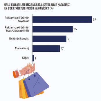 Ünlülerin yer aldığı reklamlarda tüketicilerin satın alma kararını en çok etkileyen unsur, ürünün faydaları oluyor. Katılımcıların yüzde 37’si ürünün sağladığı yararları en kritik faktör olarak görürken, fiyat/ulaşılabilirlik (yüzde 25) ve ünlünün kendisi (yüzde 21) de öne çıkan diğer unsurlar arasında.