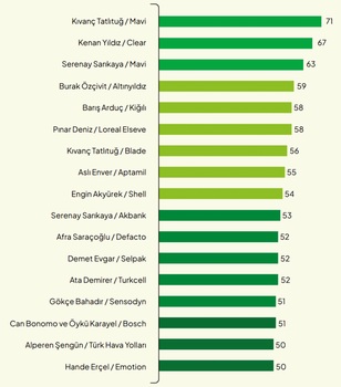 Araştırma, tüketicilerin marka-ünlü birlikteliklerini güven, sadakat, ilham ve eğlence boyutlarında değerlendirdiğini ortaya koyuyor. Ata Demirer & Turkcell, Engin Akyürek & Shell ve Serenay Sarıkaya & Akbank güvenilirlikte öne çıkarken; Kıvanç Tatlıtuğ & Mavi sadakat tarafında güçlü bir bağ kuruyor. İlham kategorisinde Kıvanç Tatlıtuğ & Blade, eğlencede ise Afra Saraçoğlu & Defacto ilk sıraya yerleşiyor. Ayrıca Hande Erçel, Barış Alper ve Kubilay Aka gibi isimlerin markalarla uyumu da farklı kategorilerde dikkat çekiyor.