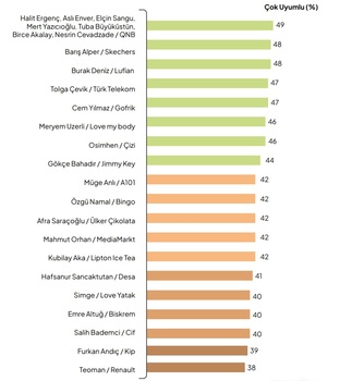 Araştırma, bazı ünlü-marka birlikteliklerinin tüketici gözünde daha zayıf bir uyum algısı yarattığını da ortaya koyuyor. Müge Anlı-A101, Özgü Namal-Bingo, Simge-Love Yatak, Afra Saraçoğlu-Ülker Çikolata, Mahmut Orhan-MediaMarkt, Kubilay Aka-Lipton Ice Tea, Teoman-Renault, Salih Bademci-Cif ve Emre Altuğ-Biskrem gibi eşleşmeler görece düşük skorlar almış durumda.