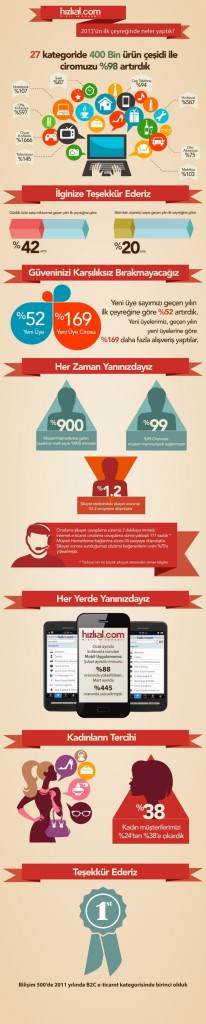 2013 yılında e-ticaret kategorisinde Bilişim 500'de 1. olan Hızlıal.com geçtiğimiz günlerde bir infografik yayımladı. İnfografikteki değerlere bakıldığında son 1 yılda çok iyi işler çıkardığı görülüyor. Cirosunu %98 artırdığını söyleyen Hızlıal.com asıl övgüyü müşteri hizmetleri tarafında alıyor. E-ticaret'te şikayete ortalama cevap verilme süresinin 177 saat olduğunu belirten bir şikayet sitesi, Hızlıal.com'un aynı cevap verilme süresini 2 dk'ya düşürüldüğünü belirtmiştir. Peki müşteri memnuniyeti ilk çeyrekte Hızlıal.com'a neler getirmiş? Yeni üye sayısı %52 artmış ve bu yeni üyeler geçen yılın yeni üyelerine göre %169 daha fazla alışveriş yapmışlar. Hizmete karşılık teşekkür mail sayısı %900 oranında artmış. Geri kalan değerler merak edenler için infografikte: