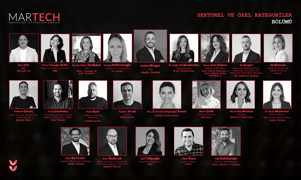 Başvurular devam ederken diğer kategorilerin jüri kadrosu da belli olmaya devam ediyor. Teknoloji Ödülleri Bölümü, Kullanım Bölümü, Mecra Bölümü, Sektörel & Özel Kategoriler Bölümü ve AI by New Generation Bölümü olmak üzere ana kategoriler altında ödülleri sahipleriyle buluşturacak olan MarTech Awards'un başvuru dönemi 30 Ocak tarihine kadar devam edecek. Bu yılın Sektörel Özel Kategoriler Bölümü kadrosu ise şöyle:
