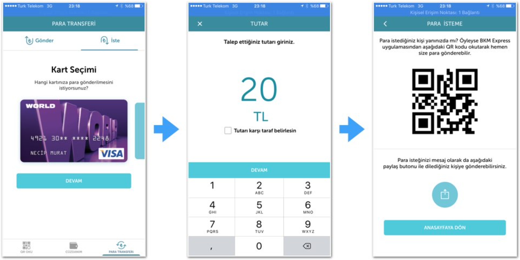 Türkiye’nin ulusal dijital cüzdanı BKM Express tam da bu noktada devreye giriyor. Bu uygulama sayesinde acil durumlarınız için arkadaşlarınızdan, ailenizden kolayca para isteyebiliyorsunuz. Nasıl mı? İlk olarak BKM Express’in mobil uygulamasına giriş yapıp para transferi bölümünden isteme kısmına geliyoruz. Ardından burada para gönderilmesini istediğimiz kartımızı seçiyor ve talep ettiğimiz tutarı giriyoruz.