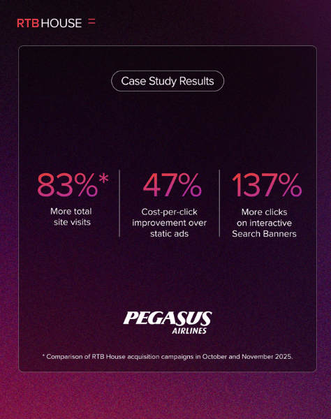 Pegasus Hava Yolları, global yapay zekâ ve reklam teknolojileri şirketi RTB House ile hayata geçirdiği yenilikçi dijital pazarlama kampanyasıyla Almanya pazarında rekor bir büyümeye imza attı. Derin Öğrenme (Deep Learning) destekli algoritmaların ve etkileşimli "Arama Banner'larının" (Search Banners) kullanıldığı kampanya, statik reklamlara kıyasla hem etkileşim hem de maliyet verimliliği açısından beklentilerin çok ötesinde sonuçlar üretti.