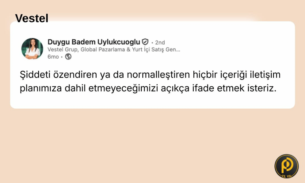 Şiddete karşı diğer bir tepki de Vestel’den geldi. Şiddetin çocuklar ve gençler nezdinde bir güç gösterisi veya yaşam biçimi olarak sunulmasına karşı mesaj yayınlayan Vestel Global Pazarlama ve Yurt İçi Satış Genel Müdürü Duygu Badem Uylukçuoğlu, "Şiddeti özendiren ya da kanıksatan hiçbir içeriğin iletişim planlarımızda yer almayacağını net bir şekilde taahhüt ediyoruz." dedi.