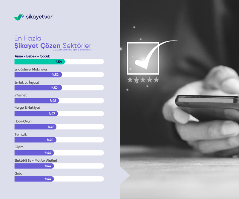 Şikayetvar'ın verilerine göre 2022’de müşterisini en çok memnun eden sektör geçtiğimiz yıllarda olduğu gibi yüzde 54'lük memnuniyet oranı ile anne-bebek-çocuk sektörü oldu. Endüstriyel makineler sektörü yüzde 52 memnuniyet oranıyla ikinci sırada yer alırken emlak ve inşaat sektörüyle internet platformları müşterisini en çok dinleyen diğer sektörler oldu.
