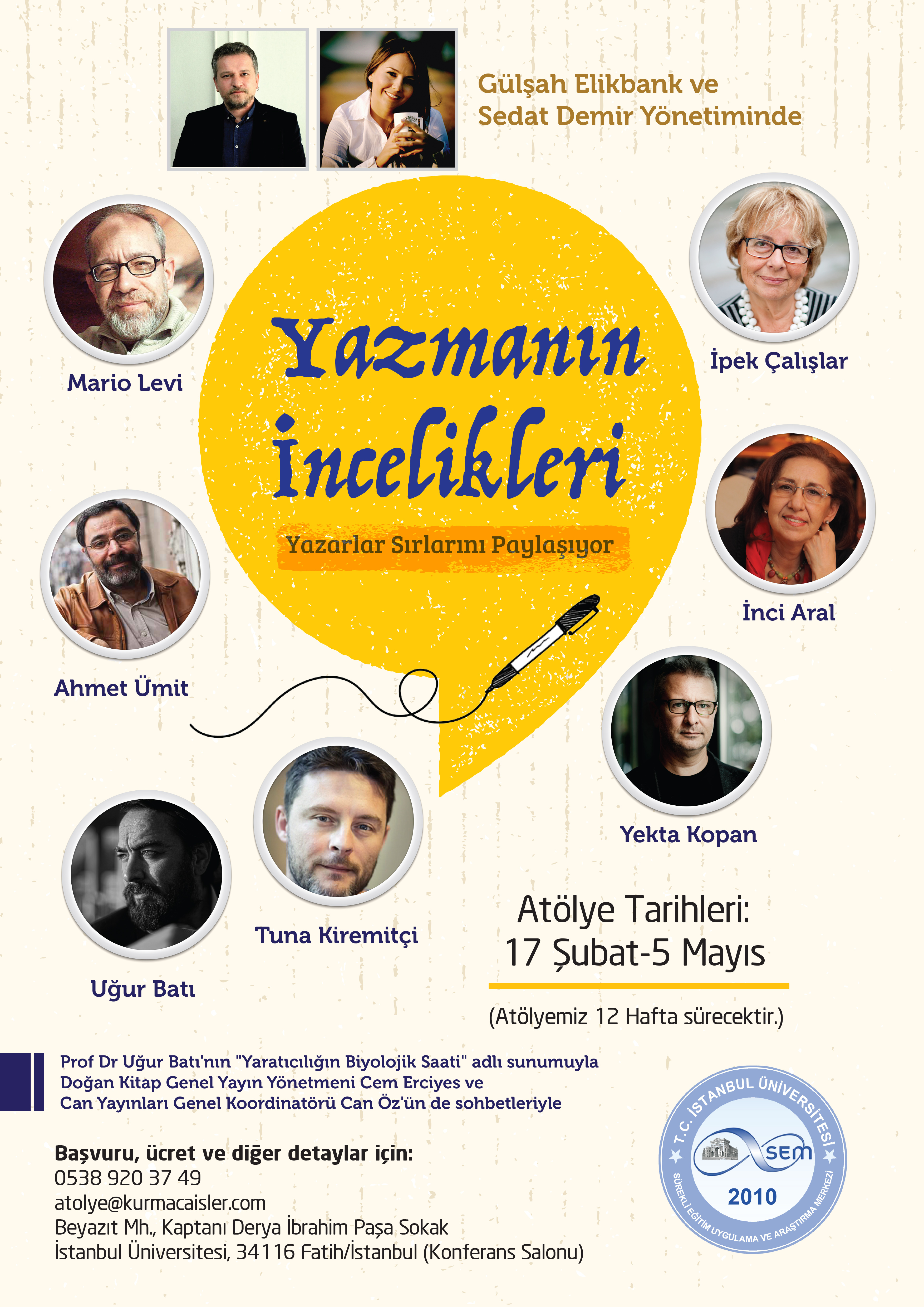 İstanbul Üniversitesi İletişim Fakültesi kendi mezunları olan yazarlar Gülşah Elikbank ve Sedat Demir’in yöneticiliği ile Doç. Dr. Ümit Sayın ve Prof. Dr. Özgür Gönenç’in danışmanlığında çok önemli bir projeye başlıyor. Yurtdışında örneklerini çokça gördüğümüz yazarlık okullarının ilk adımını atıyor. Ünlü yazarlar Ahmet Ümit, Yekta Kopan, İnci Aral, İpek Çalışlar, Tuna Kiremitçi, Mario Levi ve Prof. Dr. Uğur Batı’nın, Gülşah Elikbank ve Sedat Demir’in yöneticiliğinde vereceği eğitimlerle gençler roman, öykü yazmanın inceliklerini işin ustalarından öğrenecekler. 12 hafta sürecek eğitimin sonunda öğrenciler İletişim Fakültesi ve yazarların imzasıyla bir sertifika alacaklar.